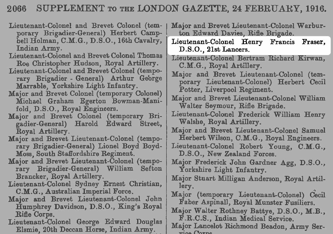官至上校,隸屬槍騎兵第二十一軍團(Colonel, 21st Lancers)。